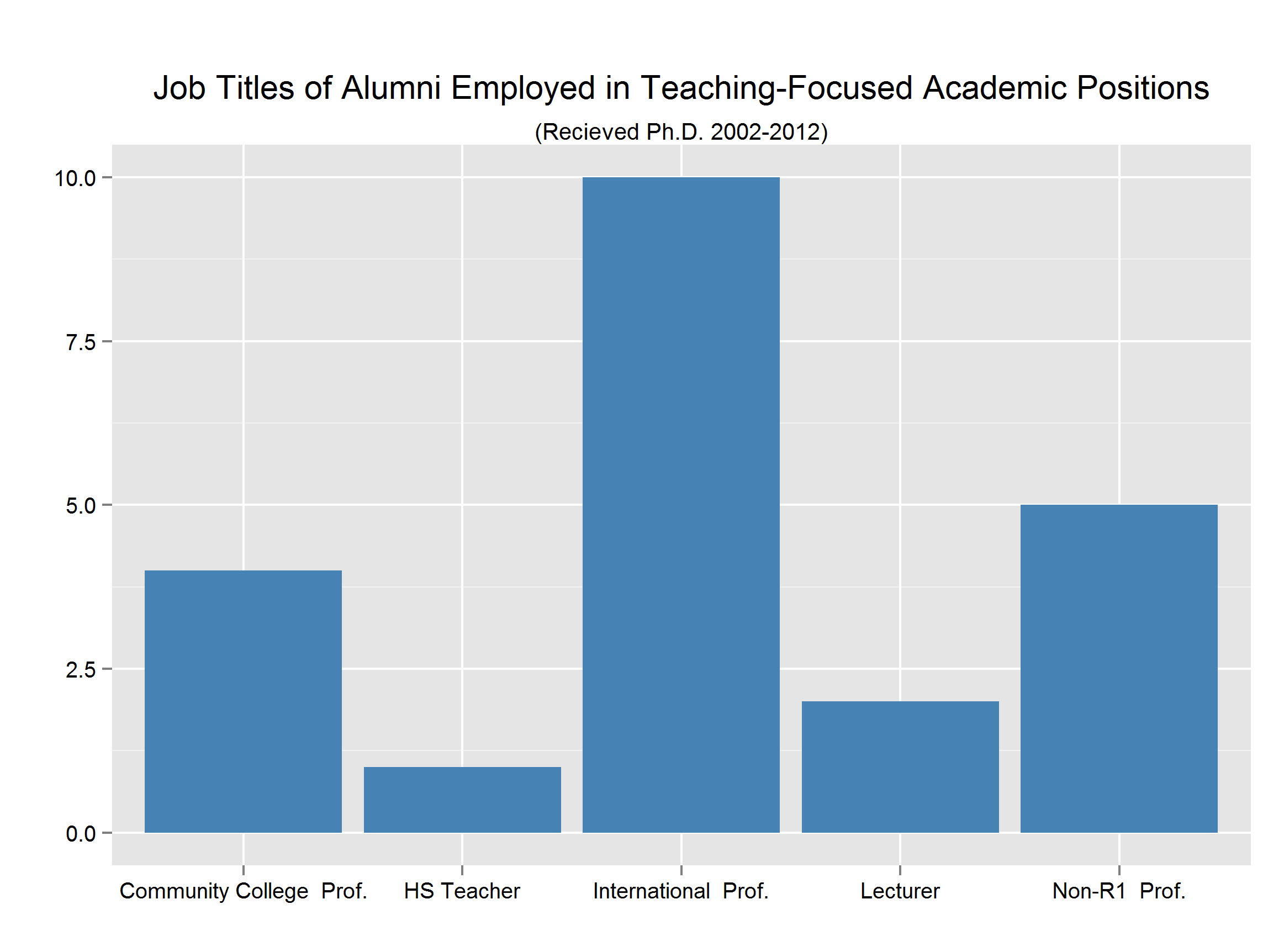 Given that the data includes many relatively recent graduates, the large number of post-docs is not surprising. It should also be noted that all but one of the “Extension Professors” listed above are at R1 institutions. I wanted to emphasize that extension positions are an option to consider for those looking for tenure-track research positions. Additionally, “International Professors” are primarily PBGG alumni that have taken positions in their home countries.